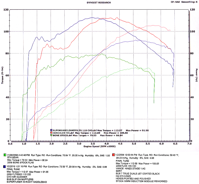 This dyno chart shows a bone stock 96 inch Touring motor, a SE100 with a K&N performance air cleaner and true dual exhaust, and a 103 Touring upgrade done by W.A.R. Performance. The W.A.R. Performance build has a considerably lower entry price than a CVO bike.
